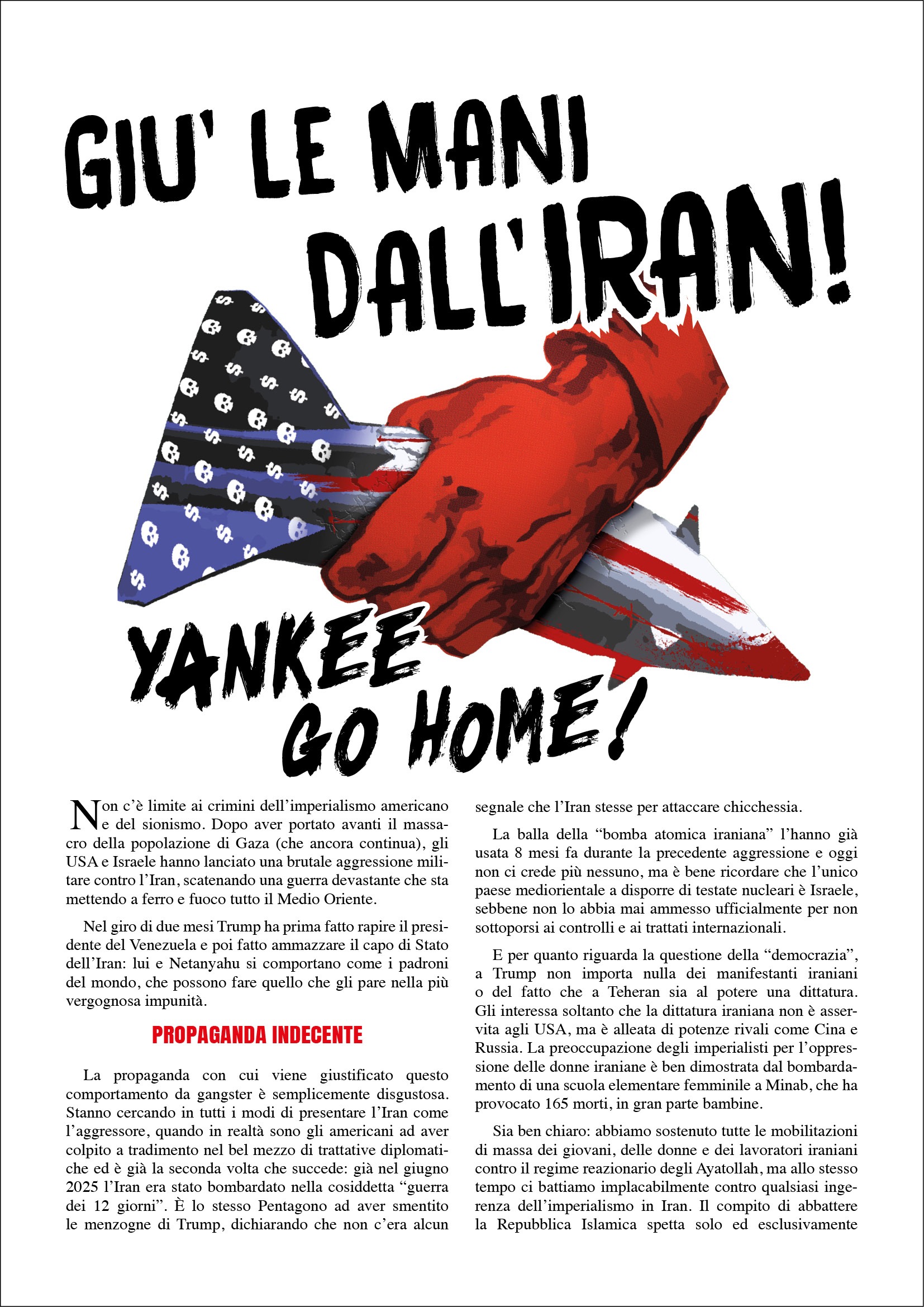 Pubblichiamo il testo del nostro volantino contro l’aggressione imperialista all’Iran, disponibile a questo link in formato pdf.
