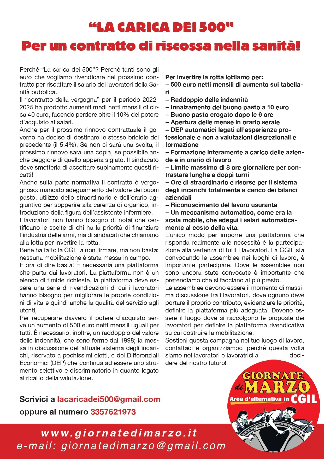 “La carica dei 500”: tanti sono gli euro che vogliamo rivendicare nel prossimo contratto per riscattare il salario dei lavoratori della sanità pubblica.